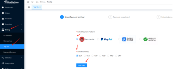 ① Operation Path: On the user center homepage, click the [Bills] module, then click [Top-up]. Select the corresponding payment platform and currency, and select [Next] to top up.