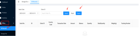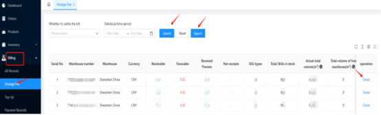 ⑥ Storage Fee Inquiry: On the user center homepage, click the [Bills] module, then click [Storage Fees], specify the data to query the corresponding order number, or click [Export] for batch querying.